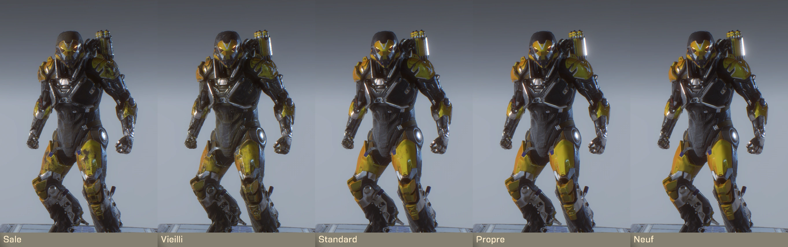 Il existe 5 états d'usure, allant de la vieille armure qui a souffert des combats, à l'armure flambant neuve sortant de son atelier de fabrication.