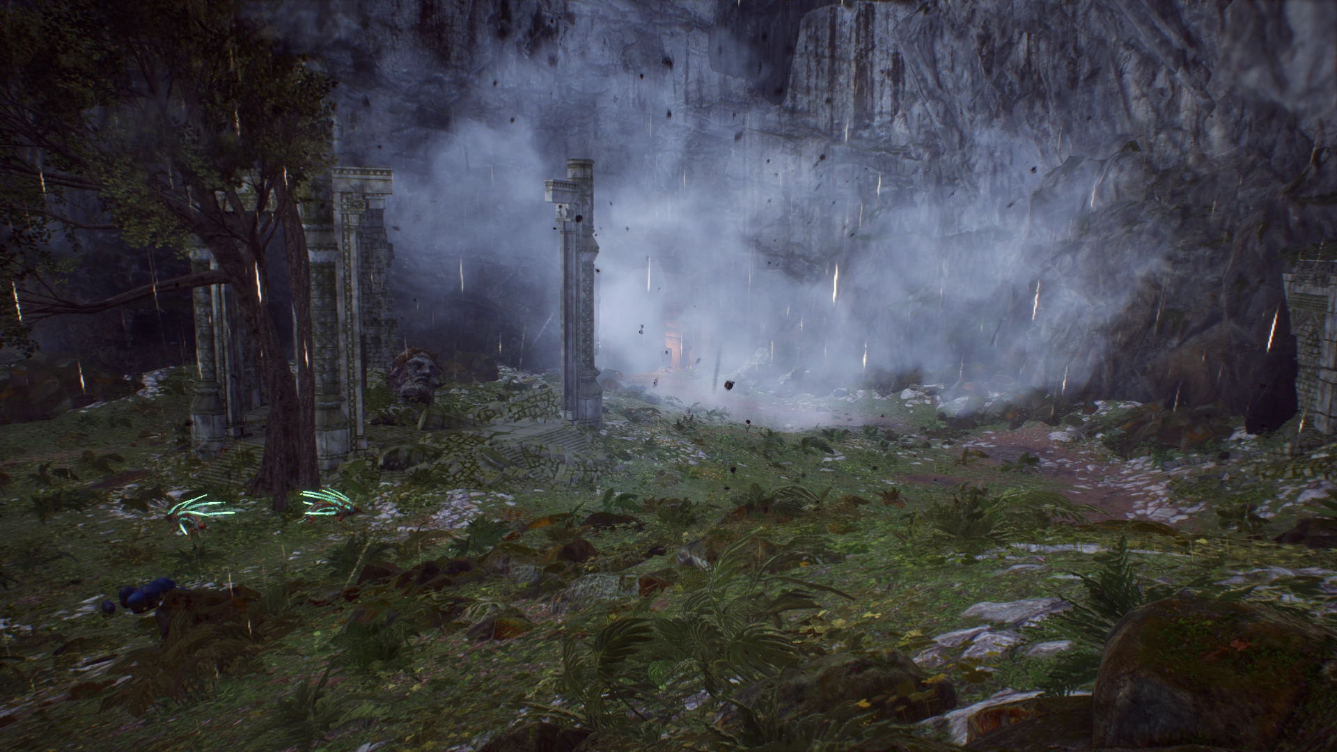 Crosslands has some Legion of Dawn architecture that is overgrown by lush flora. Some minor fauna can be found here, but they are not prominent. Other than this, Crosslands is a pretty bland location. There seems to be a gazebo of some kind that has a carved head of an unknown person here. Its purpose is not clear.