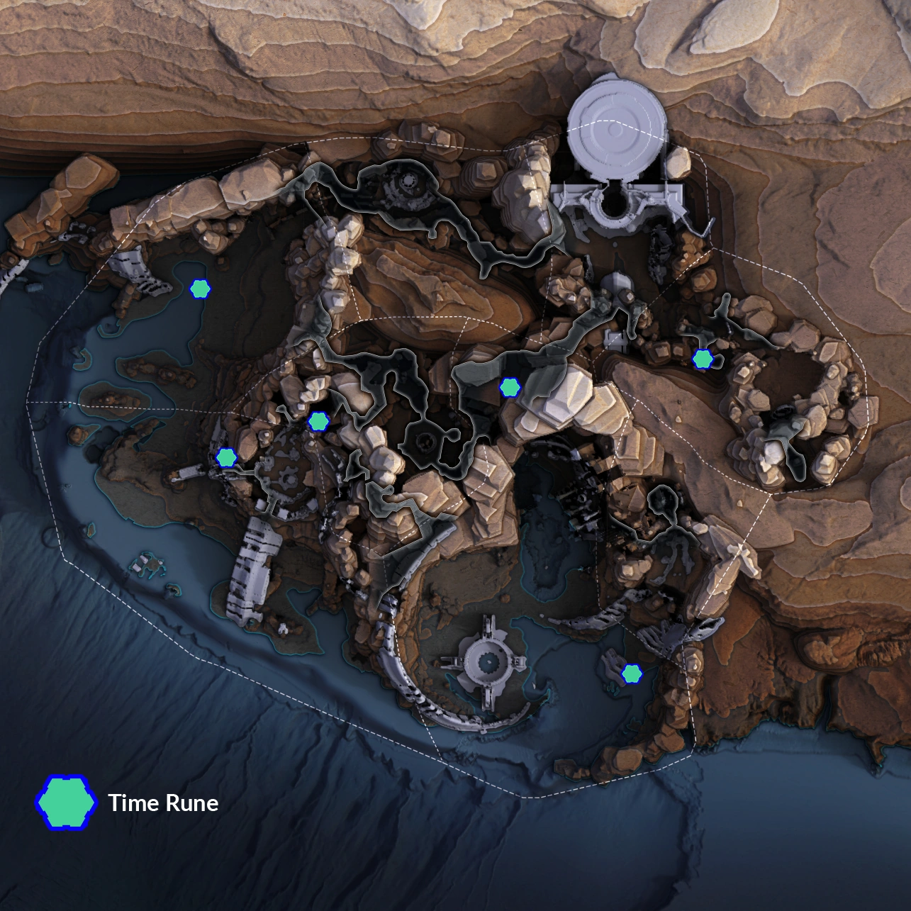 Time runes are blue-green glowing runes which add 1 minute to the cataclysm timer, and award 500 points (not considering the multiplier). There are 6 time runes scattered across the map. The map below shows their locations.