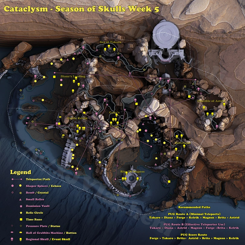 It is to be noted that only a select number of skulls are available at a time in one single cataclysm run, as skull locations can be randomized, but in set locations. The map below shows all the hidden skulls.