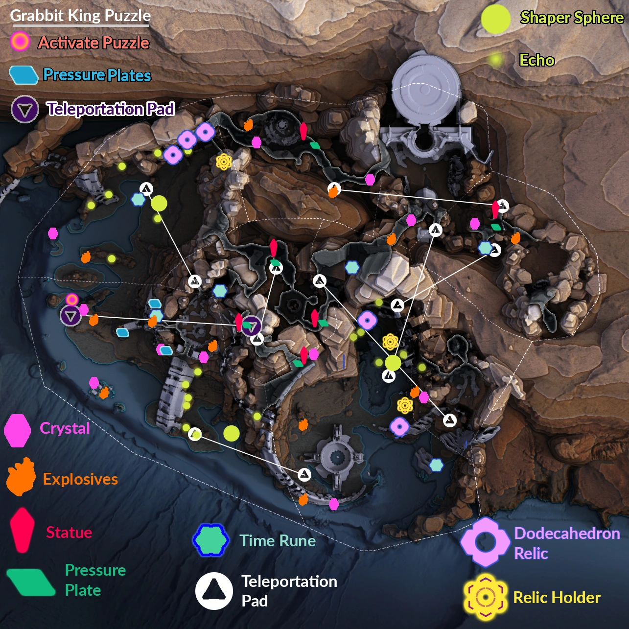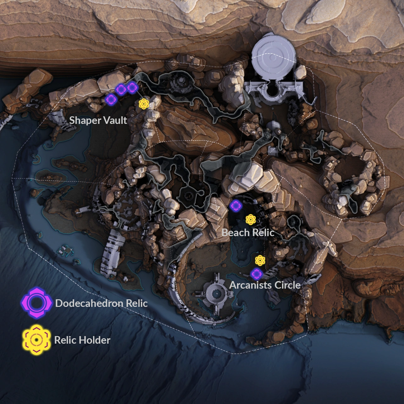 There are 3 dodecahedron relic based puzzles inside the Cataclysm. Collect the olive-colored dodecahedron relic and place it on the appropriate space. The map shows all 3 puzzles. Once solved, an Arcane Vault will be revealed which drops several Cymatic notes of blue, purple and orange types.