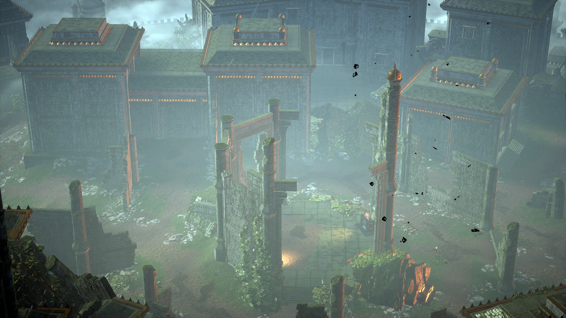 The Upper Courtyard is again filled with Legion structures. However, this is located on a higher level. There seem to be several buildings here, which likely were housings for some Legion of Dawn members. There is a gazebo at the center of the courtyard. There are stairways guarded by statues of Legion warriors that lead to the entrance of the Fortress of Dawn. There are several ruined structures of the fortress collapsed here. The Fortress' door is guarded by monumental colossi that were used to scare away any Urgoth or other enemies trying to get into the fortress. On the extreme top right and top left of the upper courtyard, there are minor plants and animals.