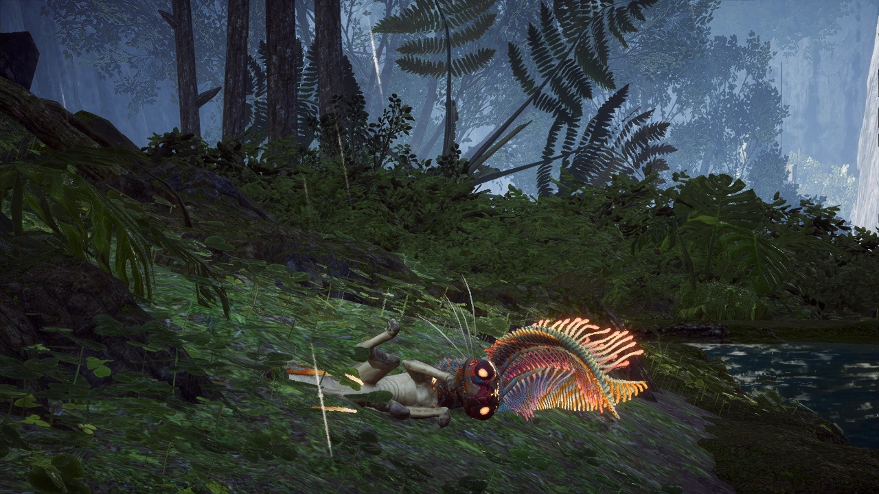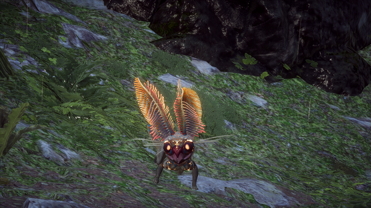 Grabbits are quadrupedal creatures with brightly colored fur: beige, blue, orange, and yellow. They have large fern-like ears that glow in bright colors, two enormous yellow eyes, and several whiskers on either sides of their cheeks. They also have a split tail with glowing tips. Grabbits can stand on two feet, but they cannot walk or run without being on all their limbs. Grabbits have an enormous mouth that can almost looks like a beak. Grabbits are known carnivores. But they mostly eat small flies and leftover carrion of Korox or other creatures. Grabbit droppings are toxic and can permanently stain clothes. Grabbits are very social creatures and live among huge families. Even if one Grabbit is missing, the whole society will be in turmoil. In the wild, usually, only a few are found all by themselves. If anyone approaches these creatures, they play around or run away. Grabbits like shiny objects, so if a lancer’s javelin is shiny enough, they stick around trying to grab their attention.