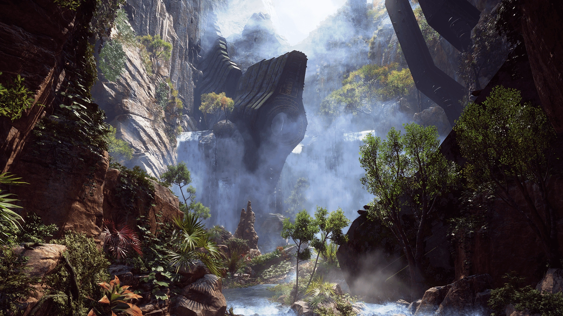 Monument Valley is entered through a large cavity on the top of a minor cave. This is located inside the Academy Ruins Subregion. It is heavily overgrown with various types of vegetations. It is so tranquil here, that water dripping can be heard when no one speaks. The ground has a few inches deep of water, suggesting that this location may partly be near a deep-water lake or under it.