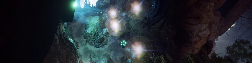 This is a tall room with a large platform found at its bottom. On the upper side there are several dormant Shaper structures, including pillars, rings, and beams. There is an opening at the top that provides lighting into this area. Going down, on the ground there are several stalagmite mounds. There are three distinct caverns that can be reached into once at the bottom of the area, which do not form the exit of the area. The exit itself is on the off side of the central platform, led by a bridge coming out of it. There is a massive Shaper Relic hanging from the center and above the platform. The first cavern is on the right side of the exit, whose entrance is a broken Shaper key. This leads to a tunnel which opens into a slightly sizeable cavern with an acidic pool on the ground, which is not corrosive. There are some Shaper instruments scattered here, amid the speleothems. The second cavern is found immediately on the right side of the first. It starts as a tunnel, and becomes a small cave with rimstone pools. Final cavern is found on the left side of the exit, and it has natural lighting, some vegetation and spleothem formations. The entry is the exit for all three of the minor caverns found in in the bottom, and all are under the platform. Skorpion eggs can be found in this area. The true exit of the area is a shaper door behind the platform.